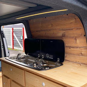 • Module frigo en Epicea PEFC, espace haut de rangement breveté Campervans Mont-Blanc.