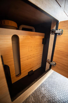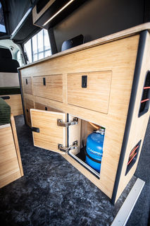 Cet aménagement présente un module cuisine très pratique, situé sur le côté droit du véhicule. Cet emplacement permet une circulation facile de l’avant à l’arrière, ainsi que le stockage de matériel volumineux dans le couloir arrière (skis, snowboard, surf, vélo...).